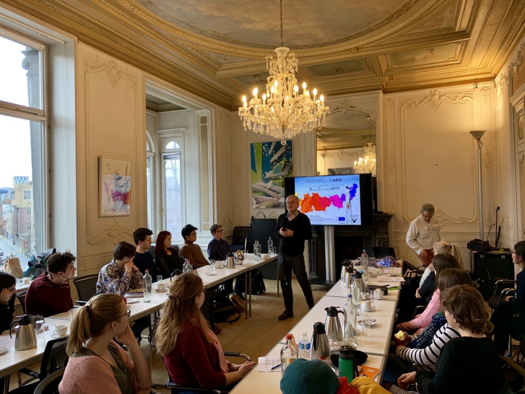 Im Rahmen des Schülerkollegs International 2018/2019 haben wir in Brüssel Ralph Dum von der Generaldirektion Kommunikation, Inhalte und Technologien sowie den Künstler René Sultra kennengelernt, die sich mit Digitalisierung und Kunst beschäftigen. Unter digitaler Kunst verstanden sie Kunst, welche mit dem Computer erzeugt wird und besonders Algorithmen genutzt werden, um Muster, Kontraste und Farbflächen zu erschaffen. Während des Workshops wurden wir in diese Thematik eingeführt und uns verschiedene Projekte vorgestellt. Als erstes sahen wir eine Installation aus verschiedenen LEDs und waren beeindruckt von den verschiedenen Farbeindrücken, die wir daraus gewinnen konnten. Außerdem sahen wir verschiedene am Computer konzeptionierte Drucke, die unter unterschiedlichen Lichteinflüssen und bei unterschiedlichen Bewegungen besondere Muster und Farbstrukturen erkennen ließen.